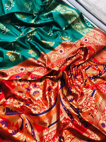 Buy Sea Green And Orange Paithani Silk Saree Online Yoyo Fashion