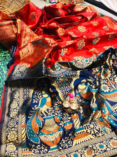 Buy Designer Red And Blue Paithani Silk Saree Online Yoyo Fashion